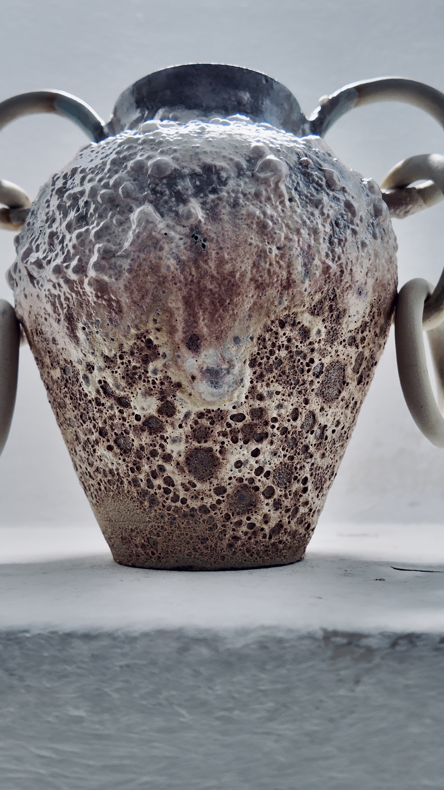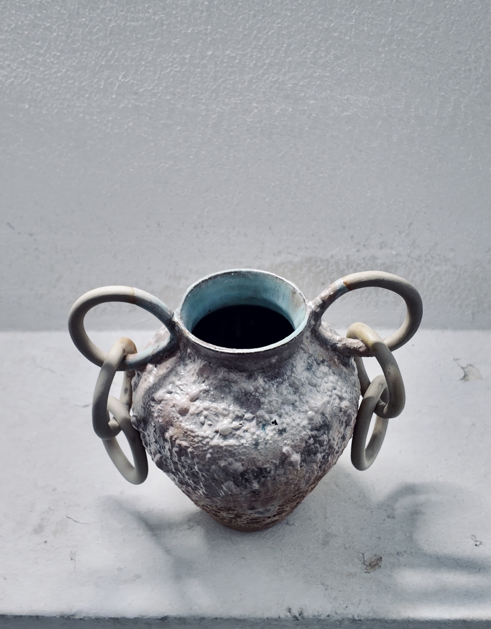 The work combines experimental glaze chemistry with bold formal design, reflecting interest in pushing the boundaries between historical form and contemporary surface.